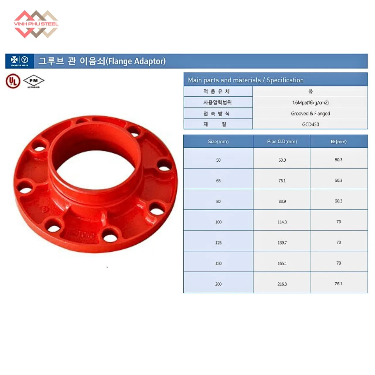 Thông số chính của Bích Nối Rãnh Joeun Korea – Grooved to Flange Adapter: