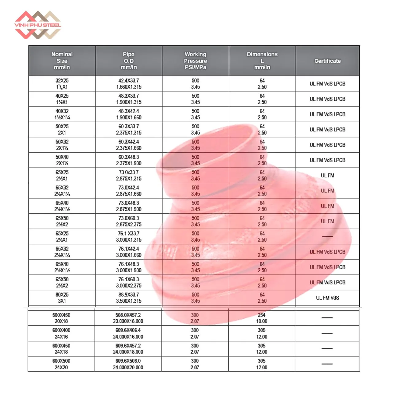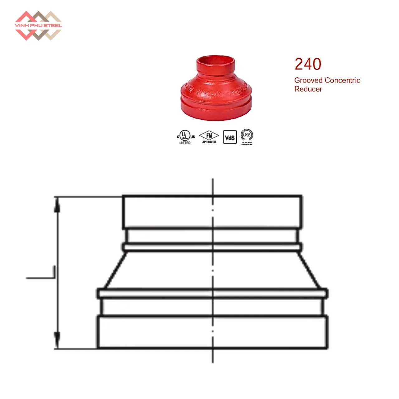 Thép Vinh Phú chuyên cung cấp côn thu đồng tâm, côn thu lệch tâm và giảm ống nối rãnh chính hãng, đạt tiêu chuẩn ASTM, ISO, UL/FM. Sản phẩm của chúng tôi đảm bảo chất lượng cao, độ bền vượt trội và lắp đặt dễ dàng cho hệ thống PCCC, HVAC, cấp thoát nước và công nghiệp.