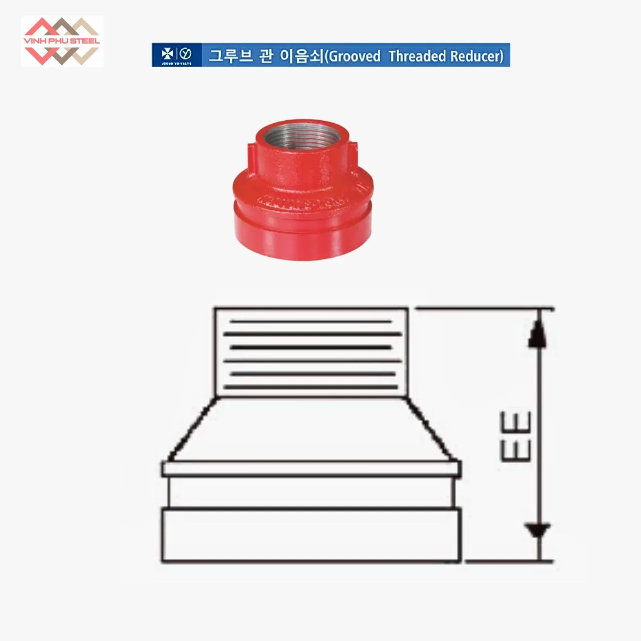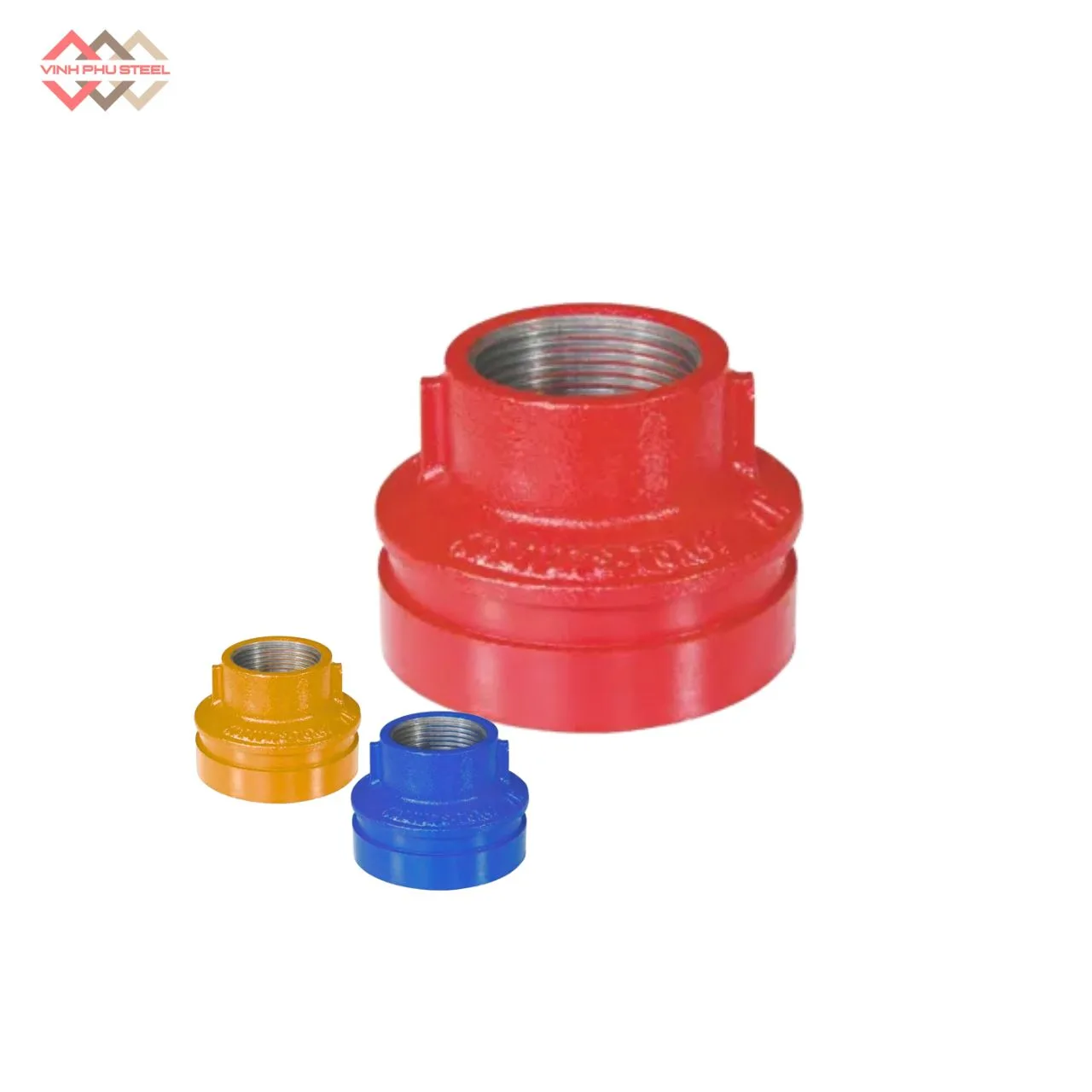 - Đầu lớn nối rãnh và đầu thu ren chuẩn giúp kết nối dễ dàng mà không cần hàn hay mặt bích.