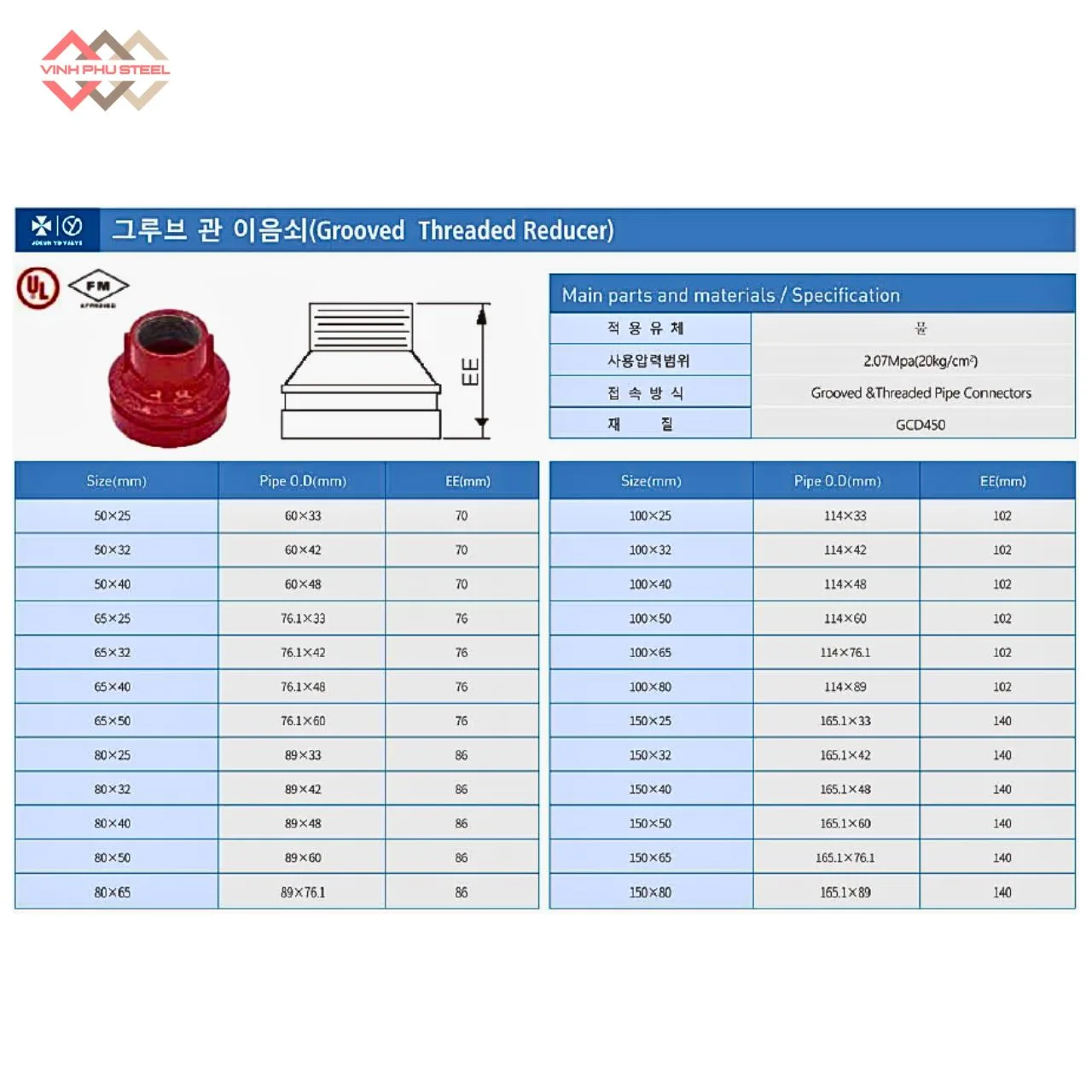 Thông số chính của Bầu Giảm Nối Rãnh Joeun Korea: