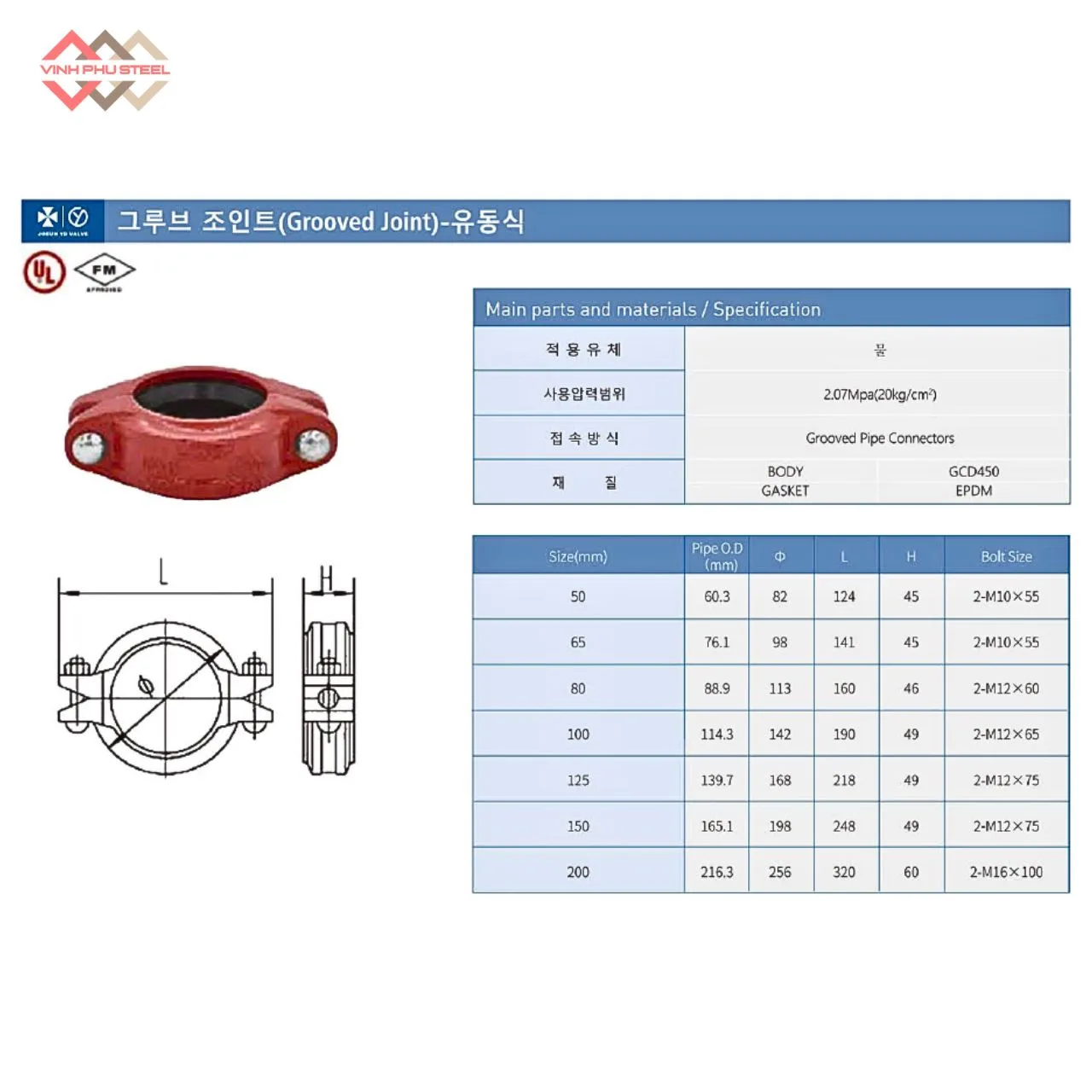 - Khớp nối được chế tạo theo các tiêu chuẩn hệ thống đường ống công nghiệp và PCCC, bảo đảm độ an toàn và độ kín trong các ứng dụng như sprinkler, HVAC, nước cấp, nước sạch hoặc hệ thống tuần hoàn.