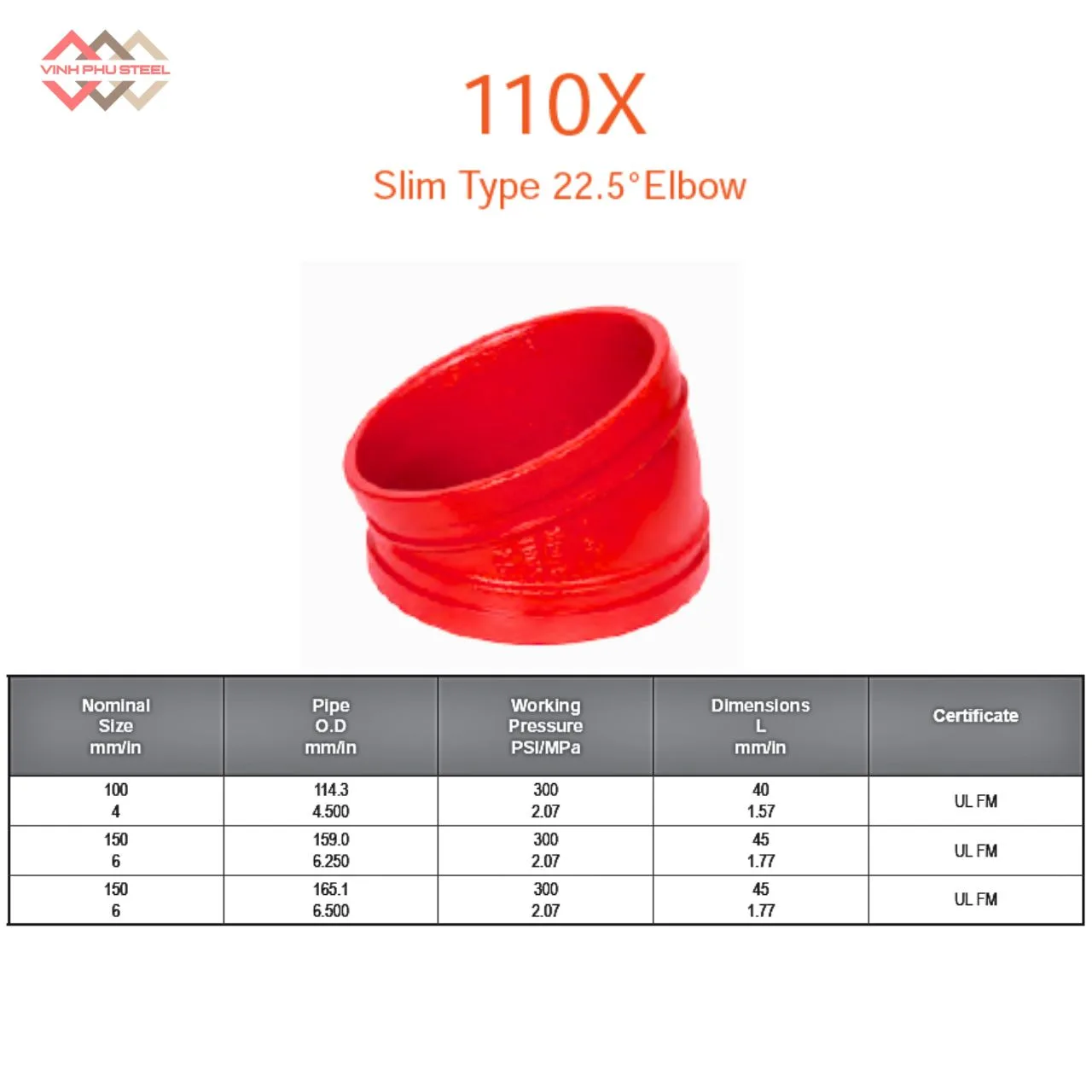 Lơi nối rãnh 22.5 độ mỏng (Slim Type 22.5° Elbow) là một loại co lơi dùng trong hệ thống ống nối rãnh, giúp thay đổi hướng đường ống ở góc 22.5 độ.