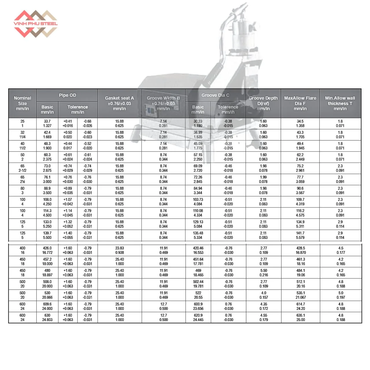 - Tiêu chuẩn rãnh: Roll Groove Dimensions – ANSI/AWWA C606, ISO 6182-12