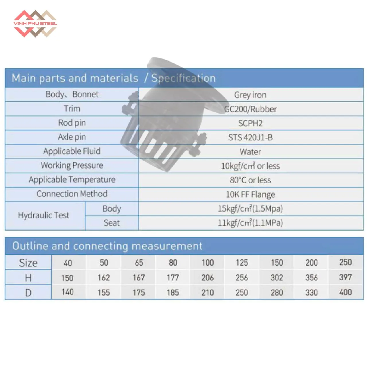 Thiết bị được thiết kế chắc chắn với thân làm từ gang xám (Grey Iron), phù hợp cho hệ thống cấp thoát nước và công nghiệp có áp lực trung bình. Cấu tạo cơ bản bao gồm các bộ phận sau: