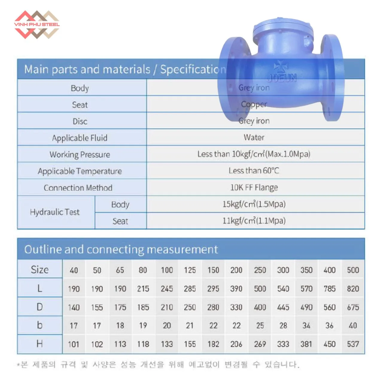 Thông Số Kỹ Thuật Van 1 Chiều Lá Lật Joeun Korea