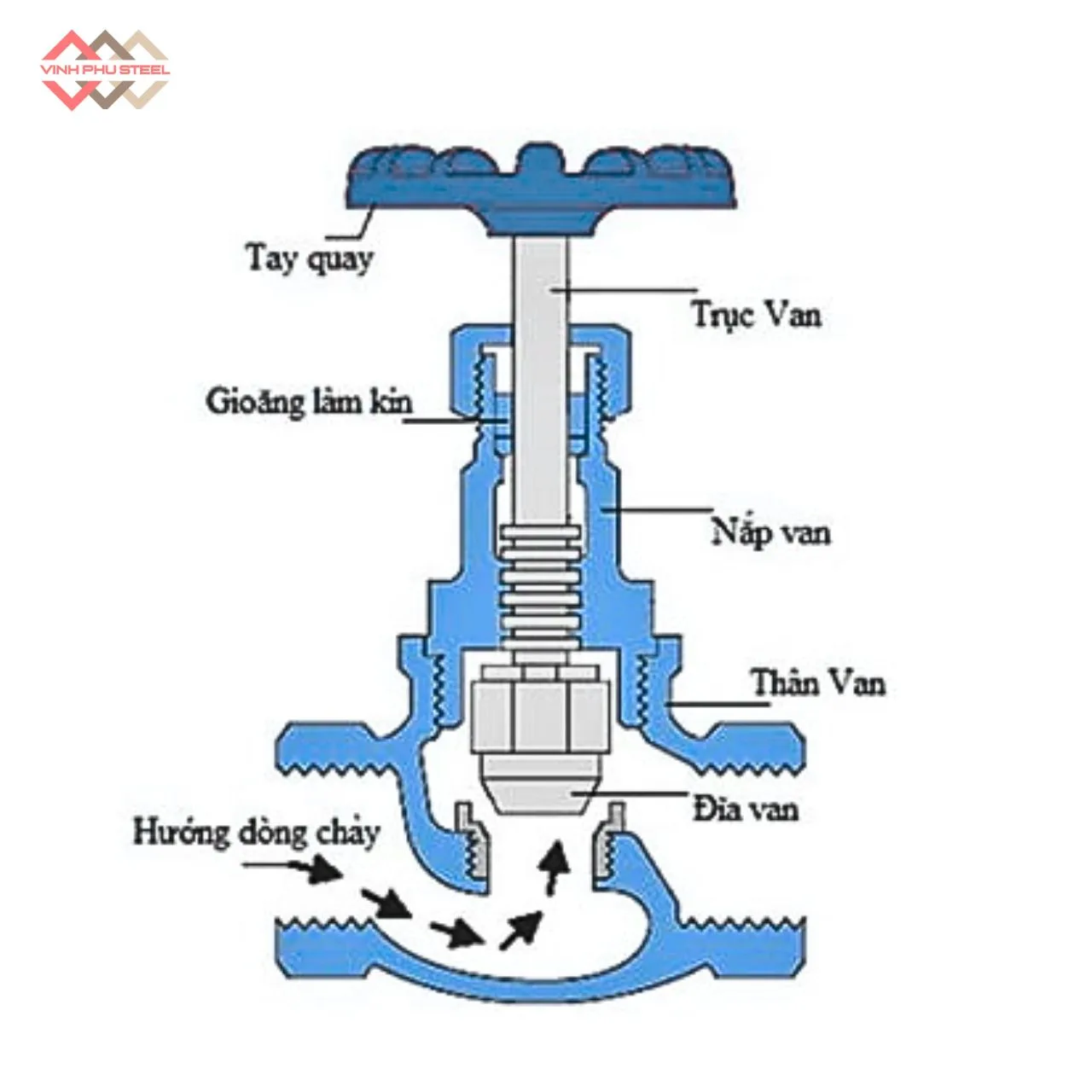 - Khi xoay tay quay, trục van di chuyển lên xuống để điều khiển quá trình đóng – mở.